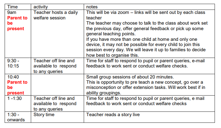 Due to their age, for children in Reception class the arrangements for remote education will differ to the above. A guide timetable is shown below: