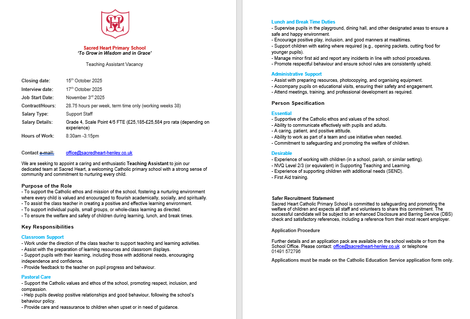 We’re excited to share that we have a vacancy for a Teaching Assistant to join our wonderful primary school team! This is a fantastic opportunity for someone who is passionate about supporting children’s learning and development in a caring and nurturing environment.